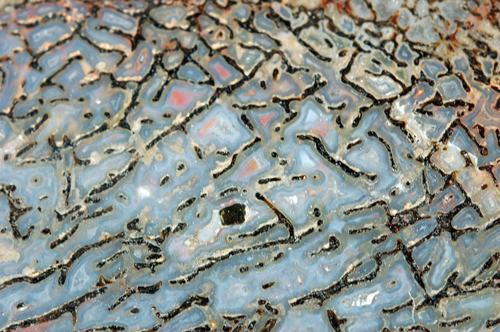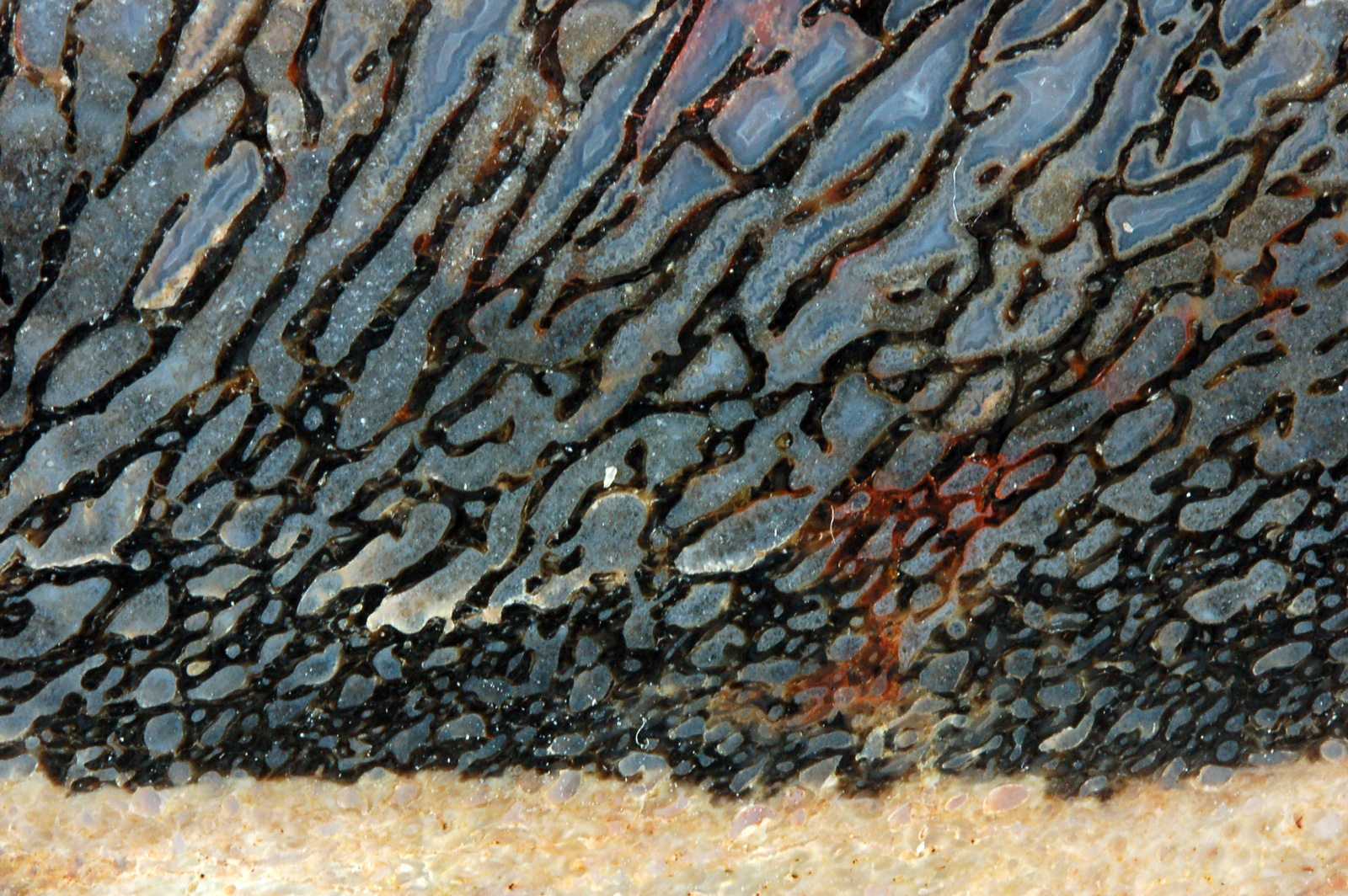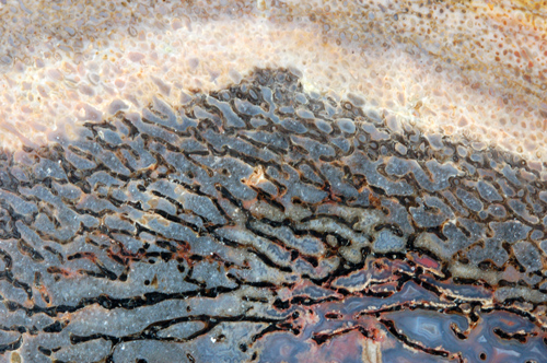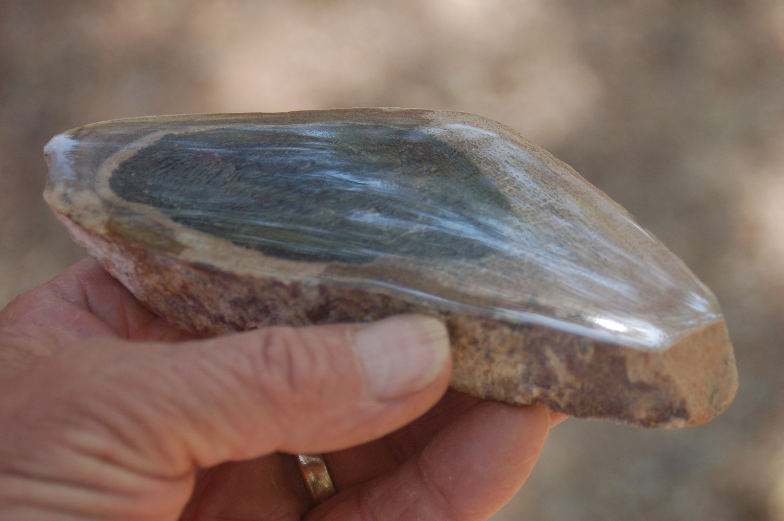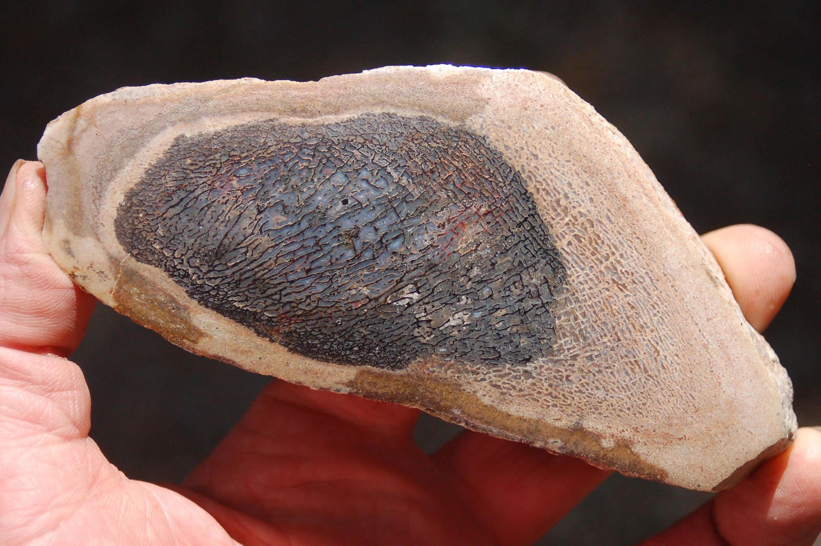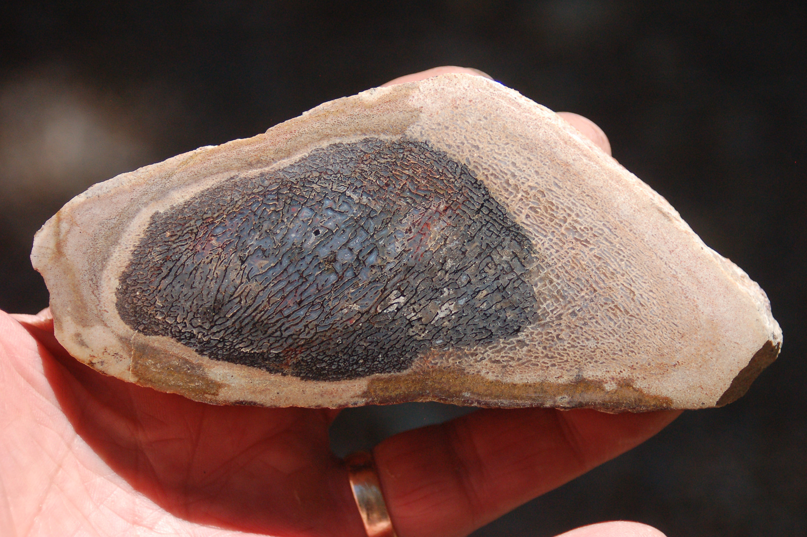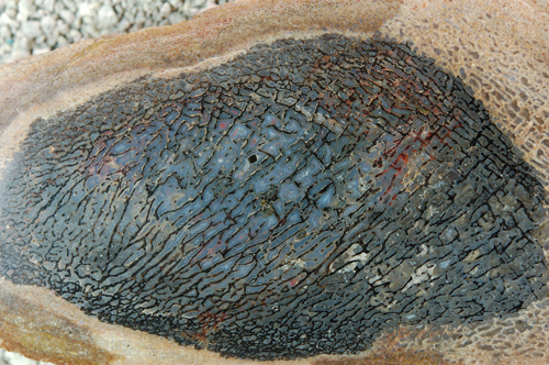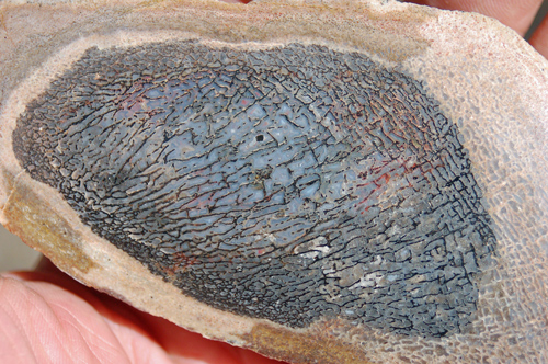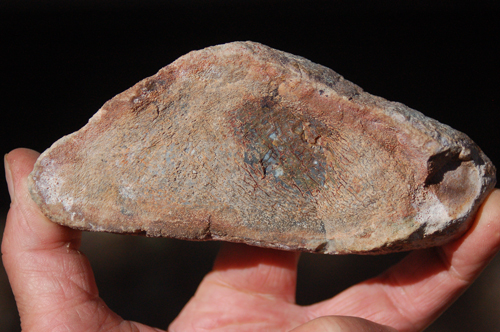This is one wild and unusual natural specimen! I’ve seen many pieces of bone with interesting color patches, but this specimen has a blue area that looks like a large stain in the center of a tan piece.