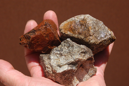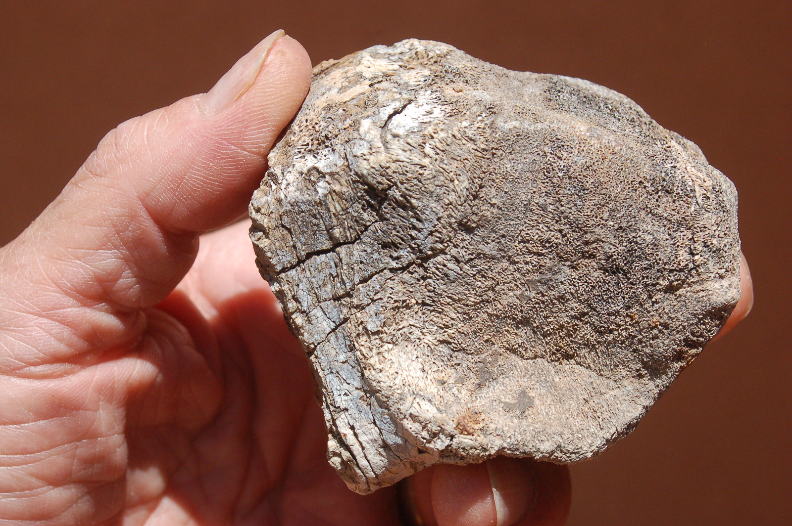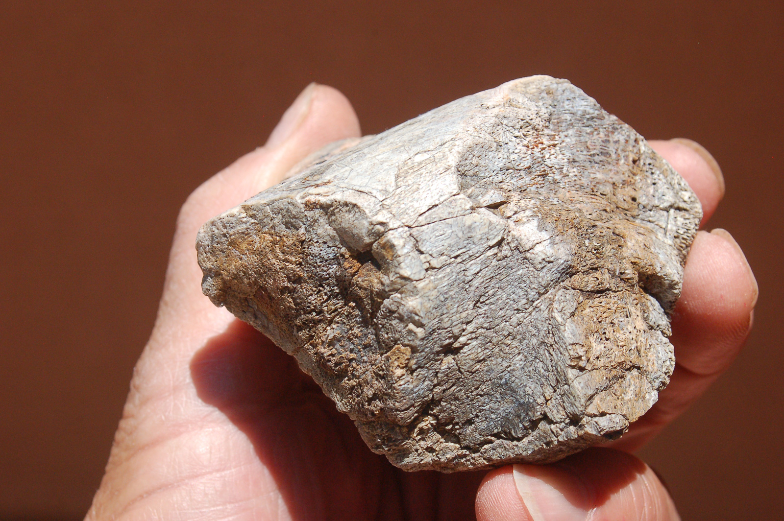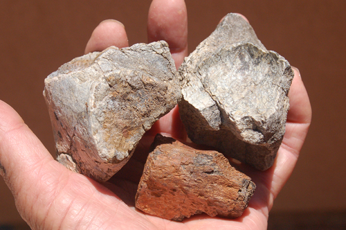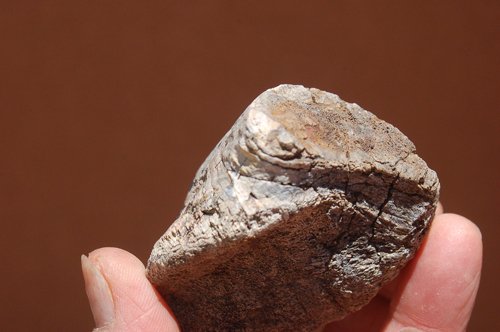 The specimen pieces I offer are just that: shards, blocks, or fragments of dinosaur bone that someone, at some point in time, picked up in the high desert region of the Colorado Plateau. Some of this material is agatized (gembone), much of it is calcified. I have sorted through many tons of broken bone material and selected pieces that had interesting features, definitive structure, and in many cases are esthetically pleasing! This lot of three includes one piece that looks like part of a jaw with hollow tooth sockets. |