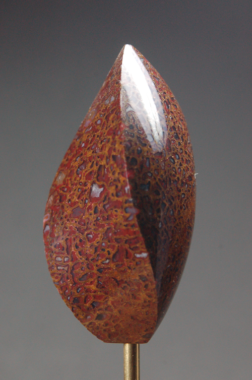 objects are shaped and polished on all sides. Later, I developed a line of framed pieces that I called the “Evolved Plant Series”. These whimsical creations represent soft, organic, flowing life forms. The series includes such work as"Fruit", "Nuts", "Amphora", "Flower Tree", "Grapes", and "Mushrooms". This led me to an exploration of animal forms, geometric designs, abstract forms patterned after the remarkable eccentric flints of the Maya, and my most recent, reproductions of the archaic Indian pictographs (1500 to 8000 years old) found on rock panels scattered throughout southeast Utah. My work involves crafting a piece of agatized dinosaur bone (gembone) with flowing curves, ridges, valleys, swales, and saddles to create pleasing organic forms. Combined with an exceptional polish I have developed over 40 years, the result is a remarkably unique presentation. Taking advantage of the amazing color diversity of this material, every creation is distinctively one-of-a-kind! Each of the different forms will have several iterations over time, but most of them will vary significantly in color. ENJOY!! |