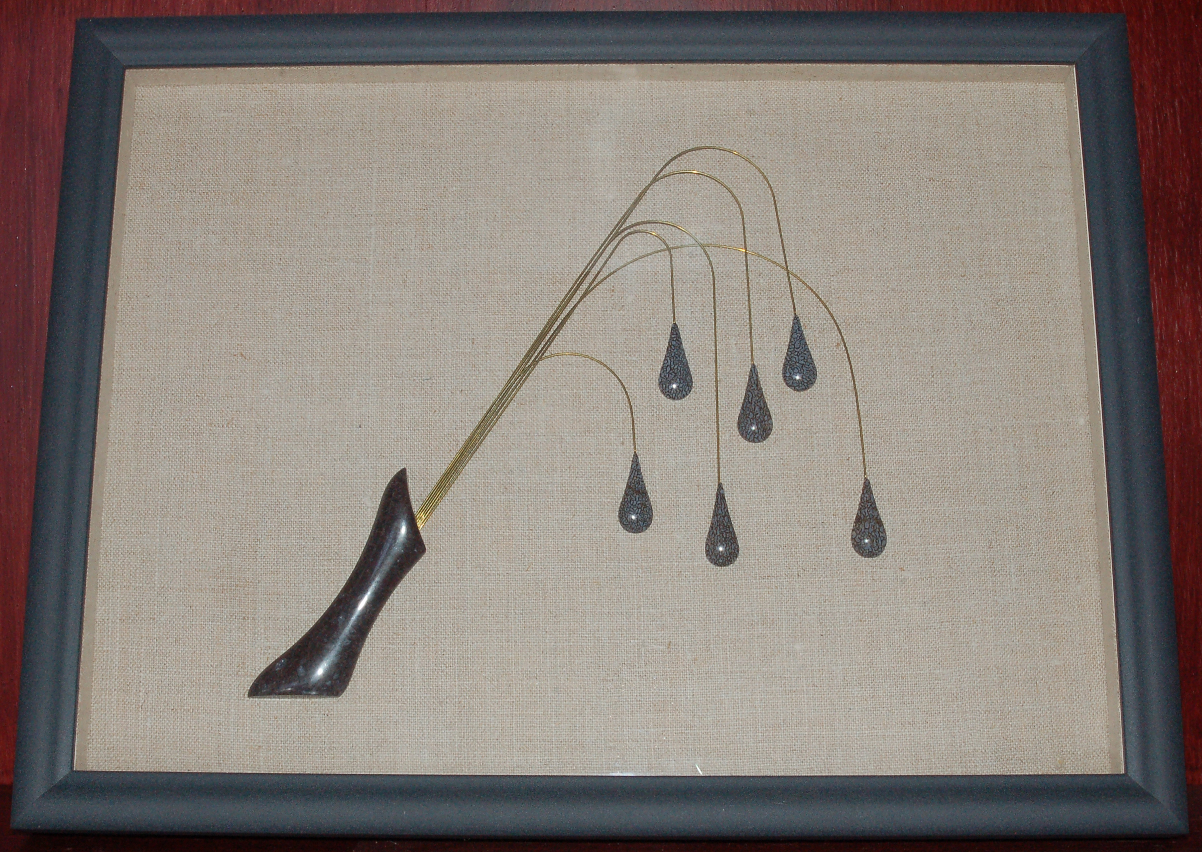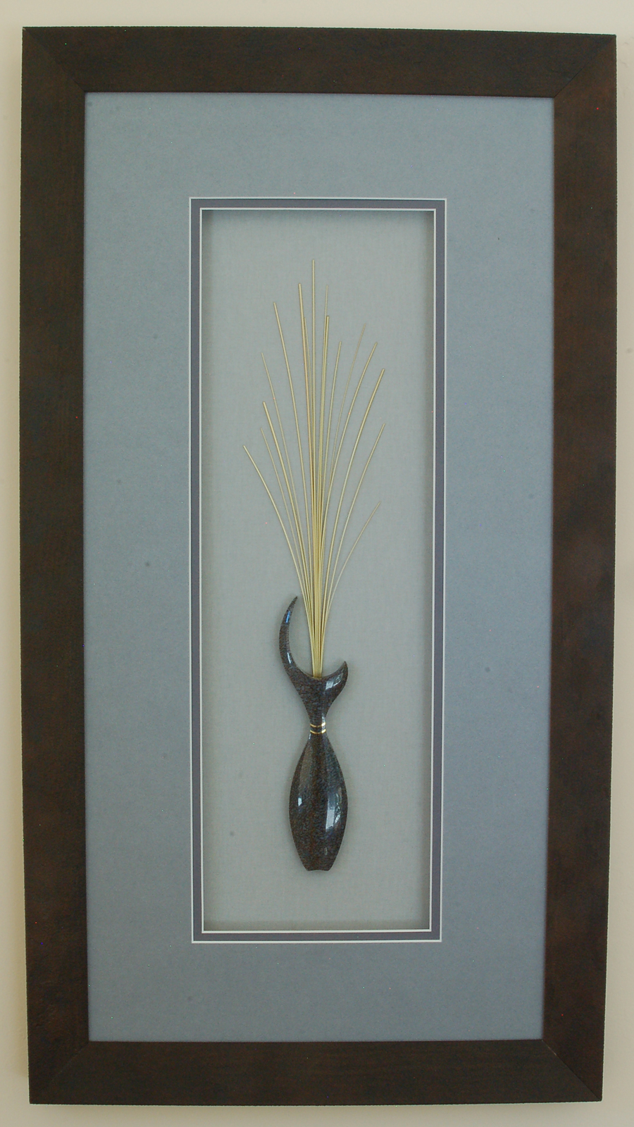 wide by 12-3/4” high. The original photography of this piece was done so long ago with an ancient digital camera that the images were essentially worthless. So, I've tried again by photographing through the glass front (at an angle to avoid reflections). The result does not do this piece justice! The "stem" is actually a magnificent piece of blue-black spiderweb with gorgeous white agate swirls in some of the cells. The "fruit" are a deep blue color. Each stone is masterfully crafted and beautifully polished! Please Note: The folks at Toklat Gallery decided to re-frame Fruit I. Unfortunately, I do not have good photos of the frame, so please contact the gallery for images and pricing. |