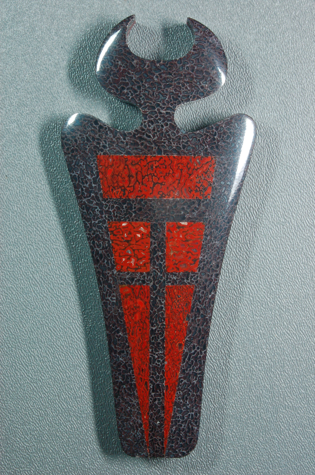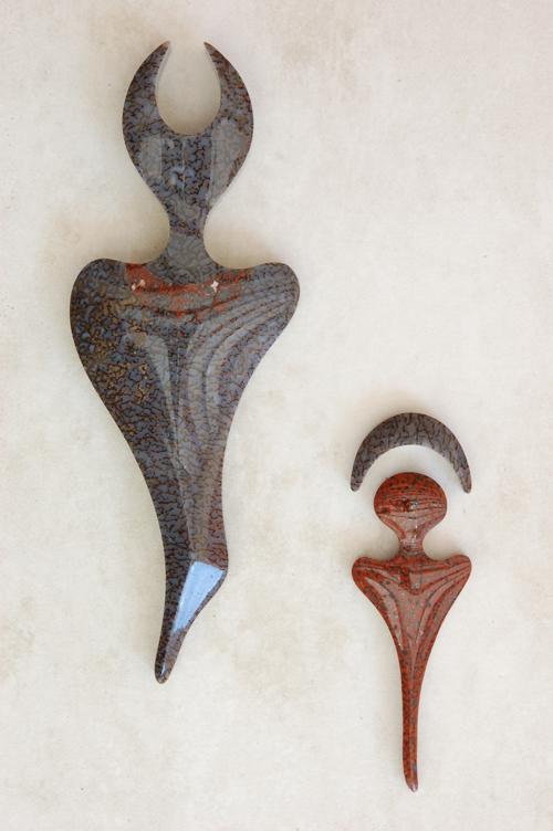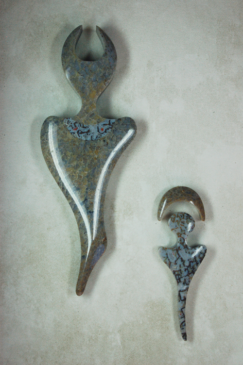 Series These ethereal figures are representations of ancient pictographs (up to 5,000 years old) found in the remote Canyonlands of Utah. Their meaning has been lost over time; however, the notion of shamans and deities certainly jumps out at you. The beautiful imagery created by these archaic tribes is as inspiring as it is mesmerizing. The main figure in these representations is ≈6" x 2" x 1/2". They are all made out of the finest quality agatized dinosaur gembone |
