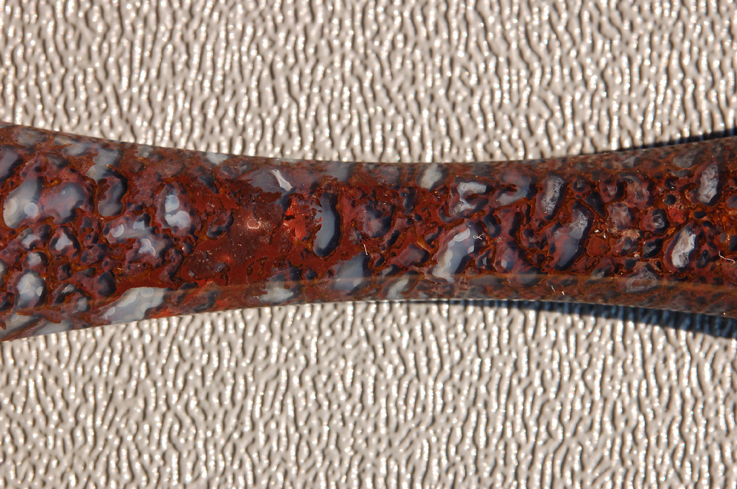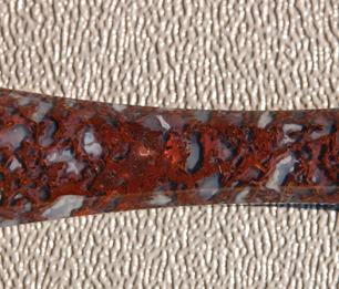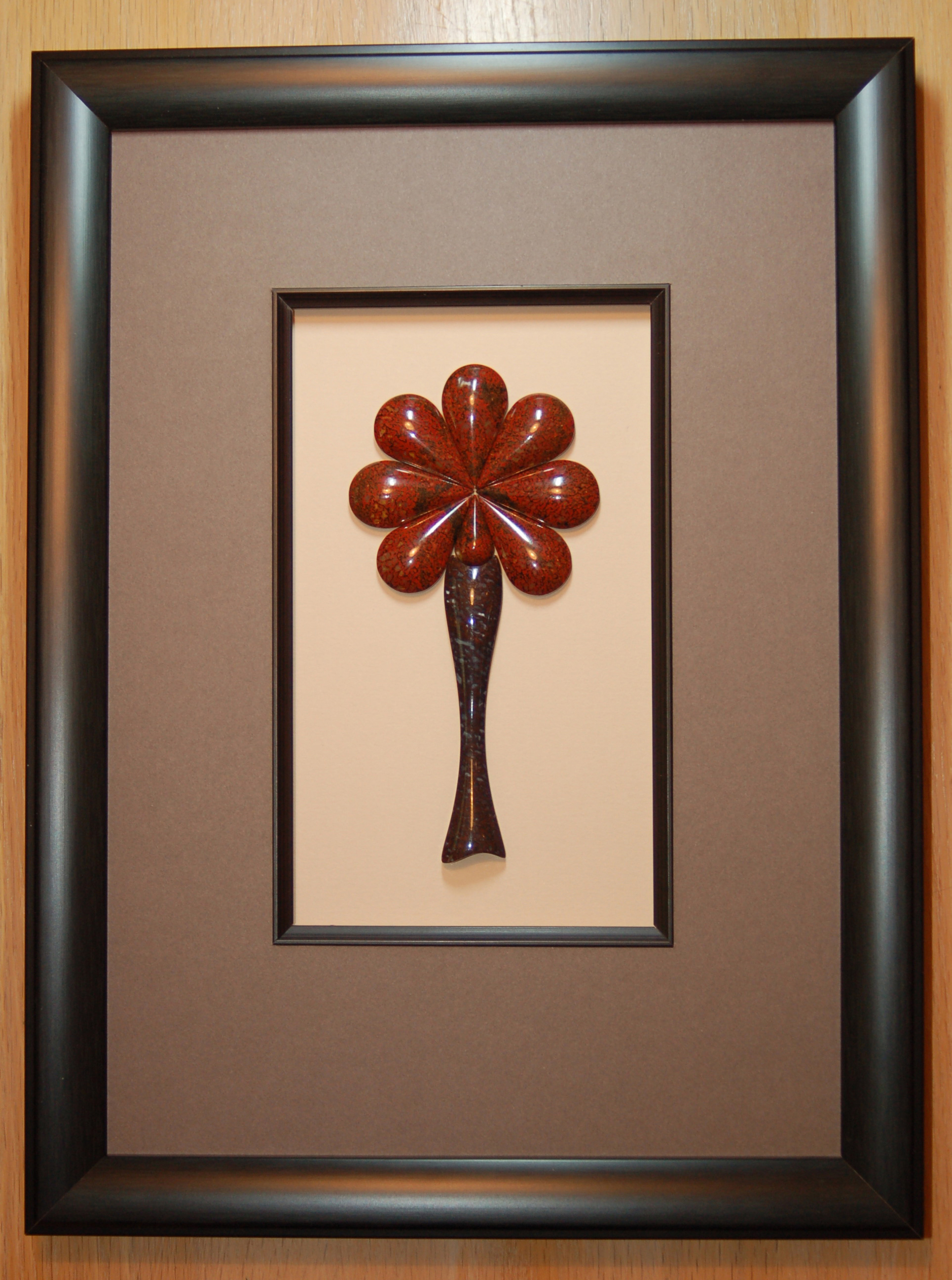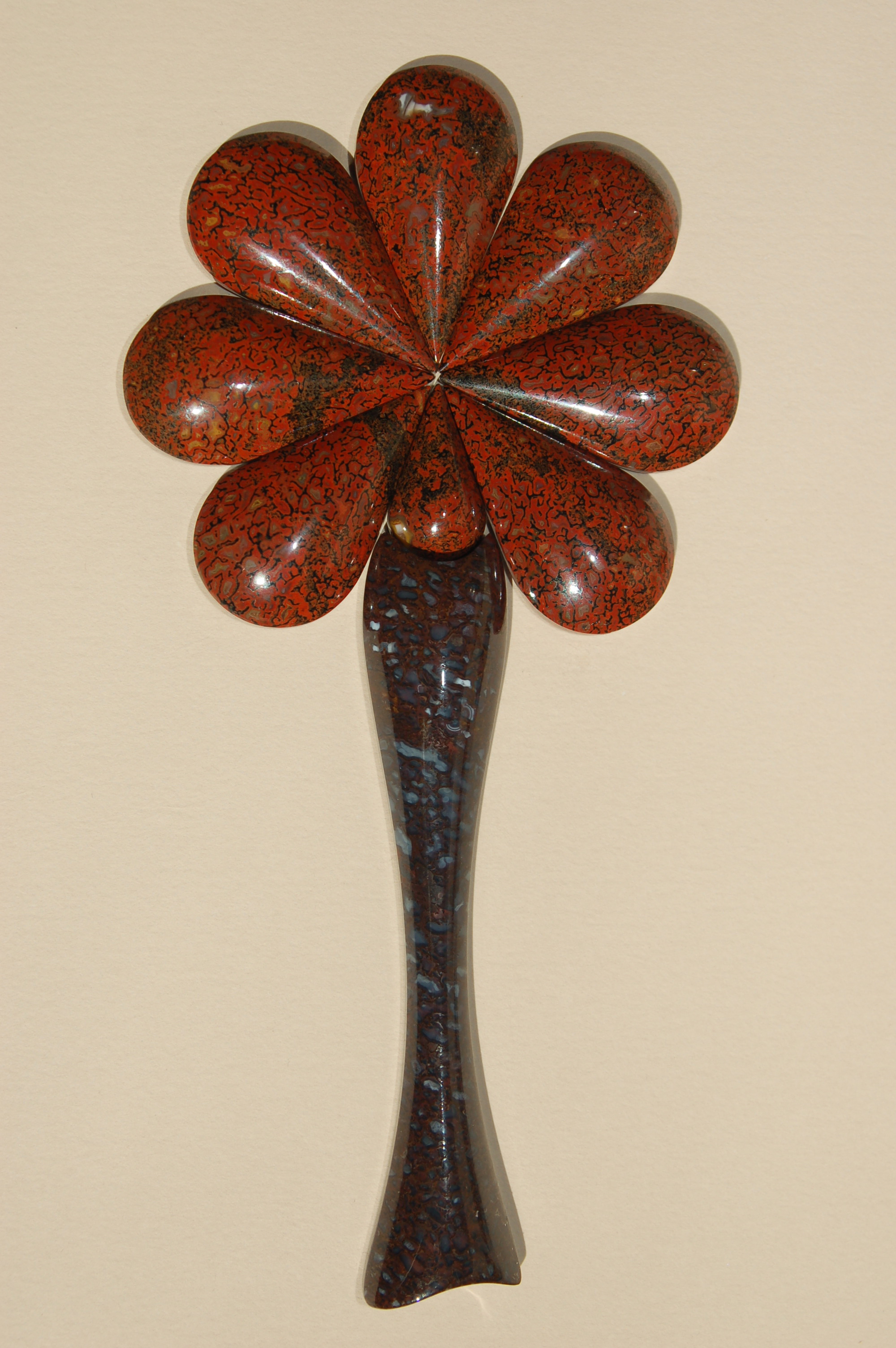exact same color scheme. The actual size of the "stem" is ≈4-3/4" x 3/4". The actual size of the larger "petals" is ≈1-1/2" x 13/16". The overall size of the complete stone piece is slightly larger than 6" x 3". The final size with the frame is 11-1/8" x 14-7/8". Because of the difficulties photographing highly polished material, several "anomalies" have shown up. In each photo below, there is a reflection that could be mistaken for a fracture. Not So!! There are no fractures in any of the components making up this piece! |