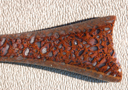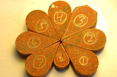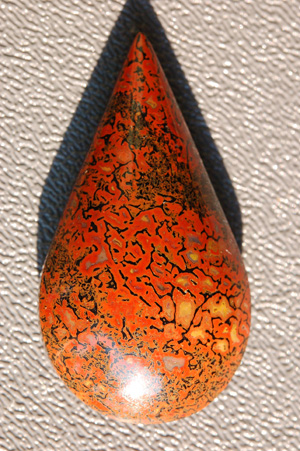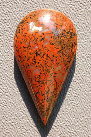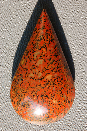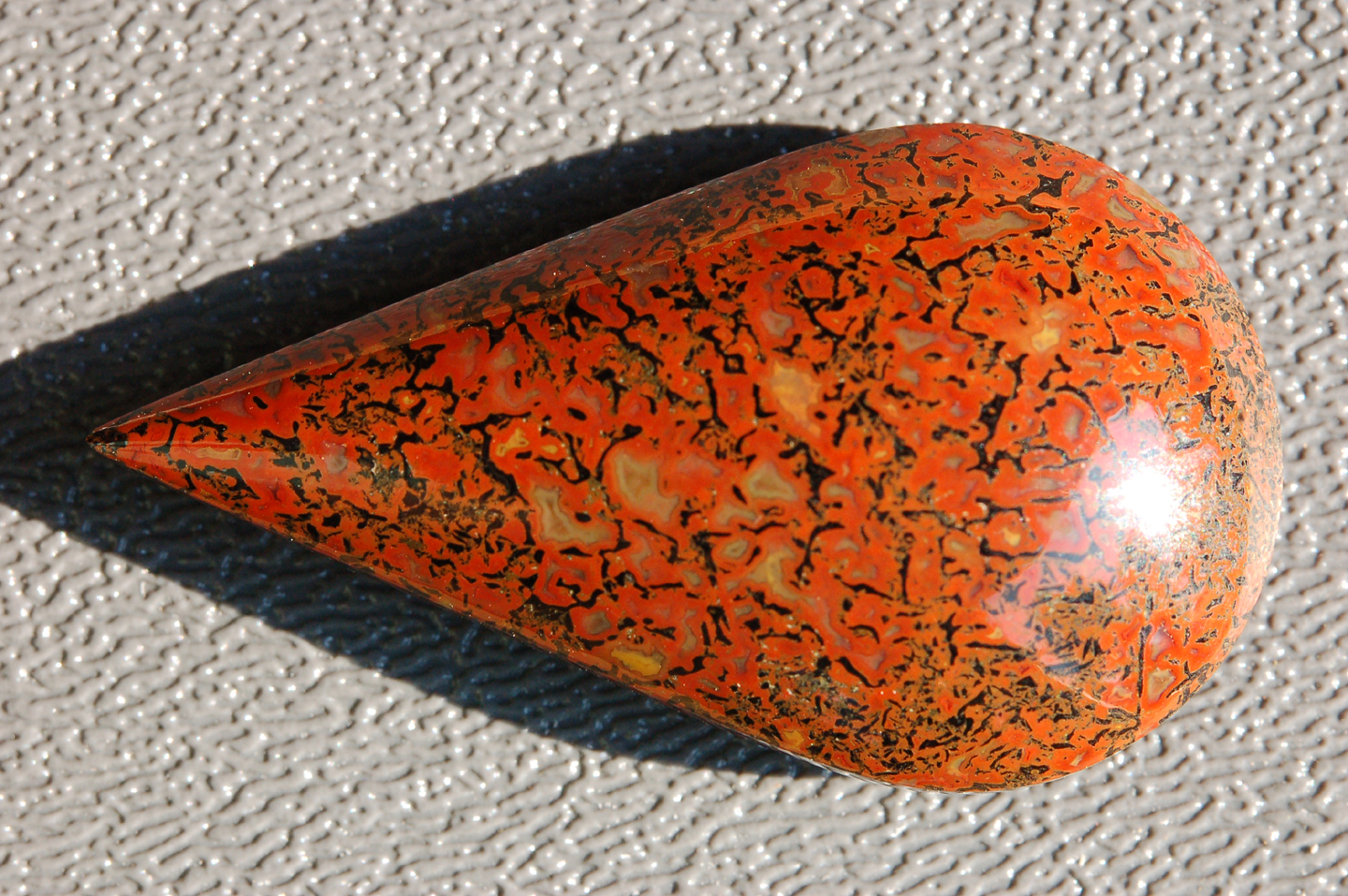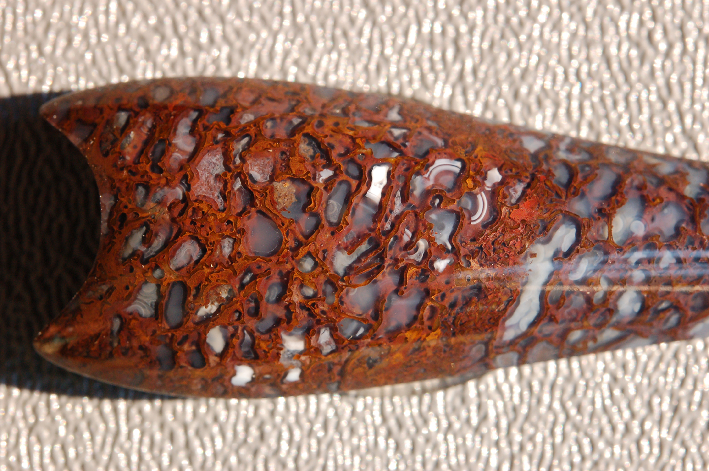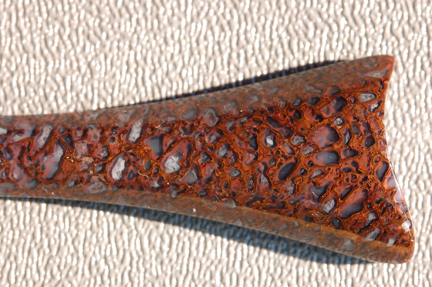 exact same color scheme. The actual size of the "stem" is ≈4-3/4" x 3/4". The actual size of the larger "petals" is ≈1-1/2" x 13/16". The overall size of the complete stone piece is slightly larger than 6" x 3". The final size with the frame is 11-1/8" x 14-7/8". Because of the difficulties photographing highly polished material, several "anomalies" have shown up. In each photo below, there is a reflection that could be mistaken for a fracture. Not So!! There are no fractures in any of the components making up this piece! |