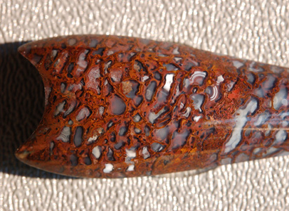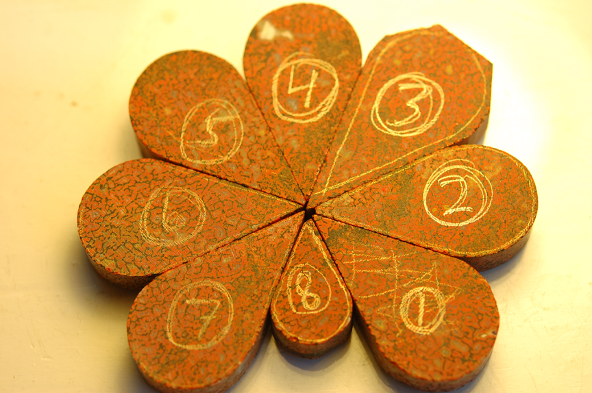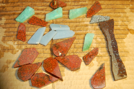 | These photos show the preliminary stages of this project. First, there is the idea, which may require numerous drawings to fine-tune. Then, the appropriate bone must be determined. There are many different color combinations possible, but this requires that the available stock be of adequate size so that no fractures are incorporated into the finished piece. The shapes are sketched onto the bone, sawed out, then ground to the required profile. The pieces are then "dopped" onto a nail or wooden dowel handle and ground/sanded/polished to a high glossy finish. |