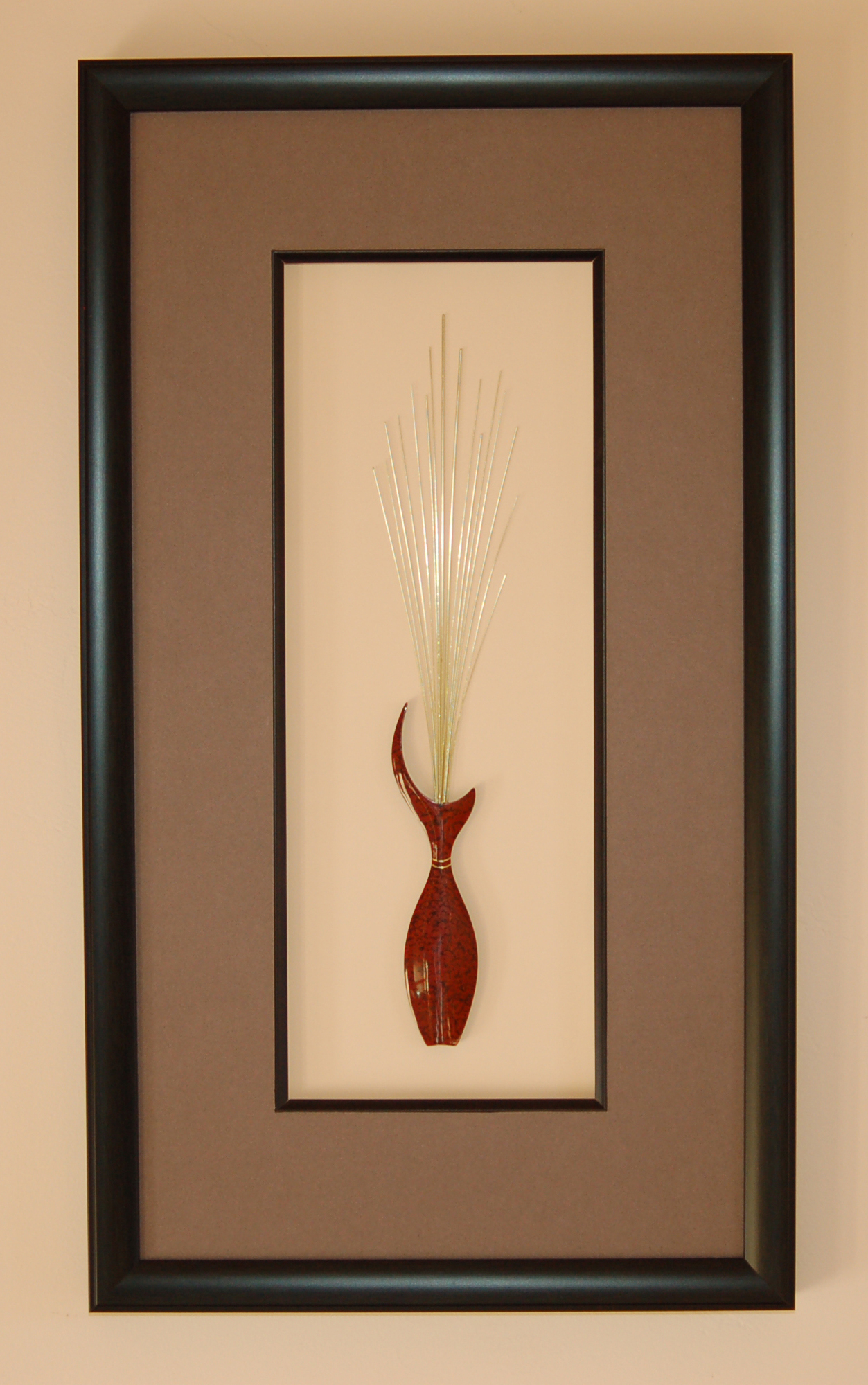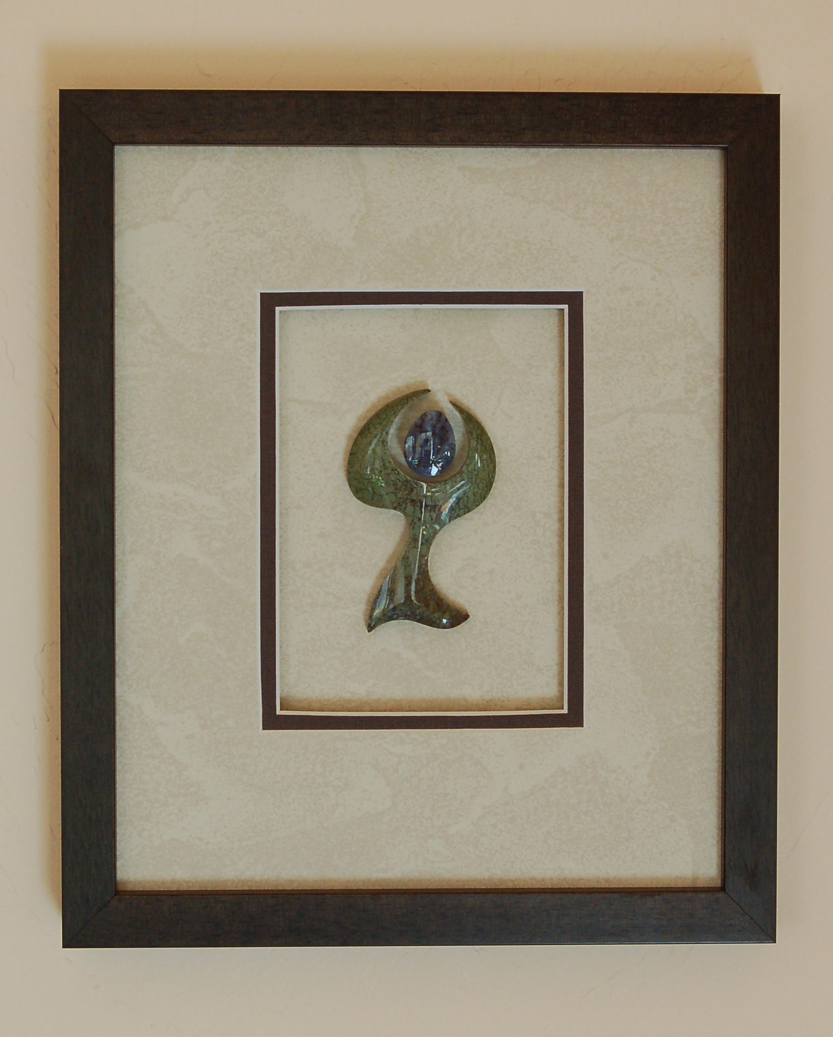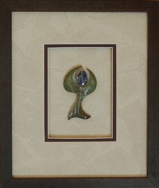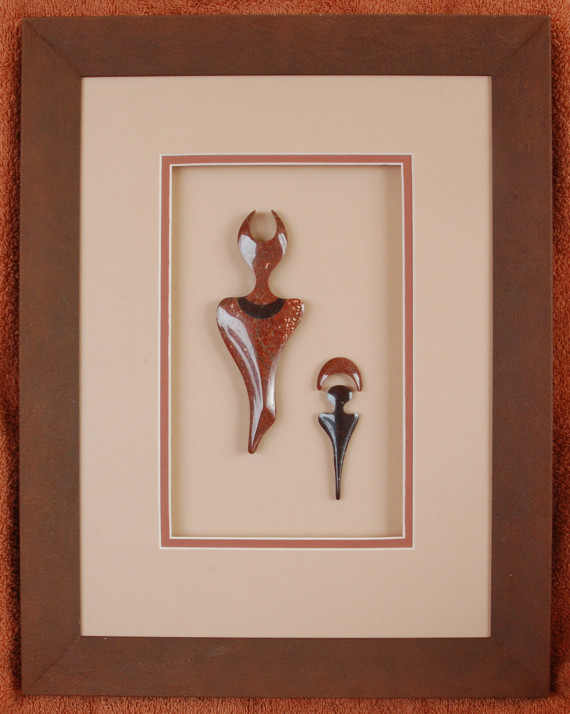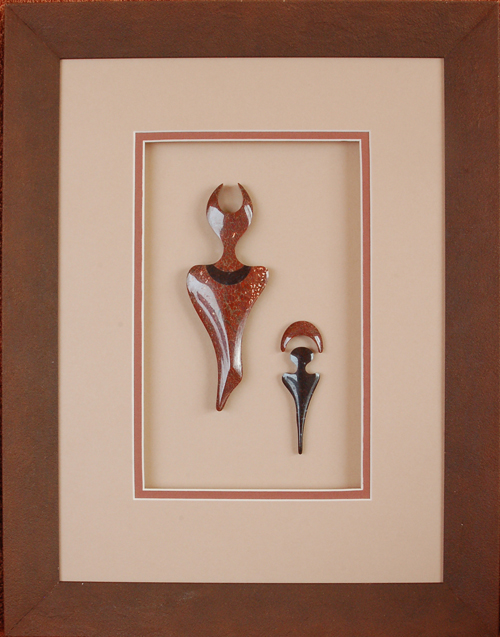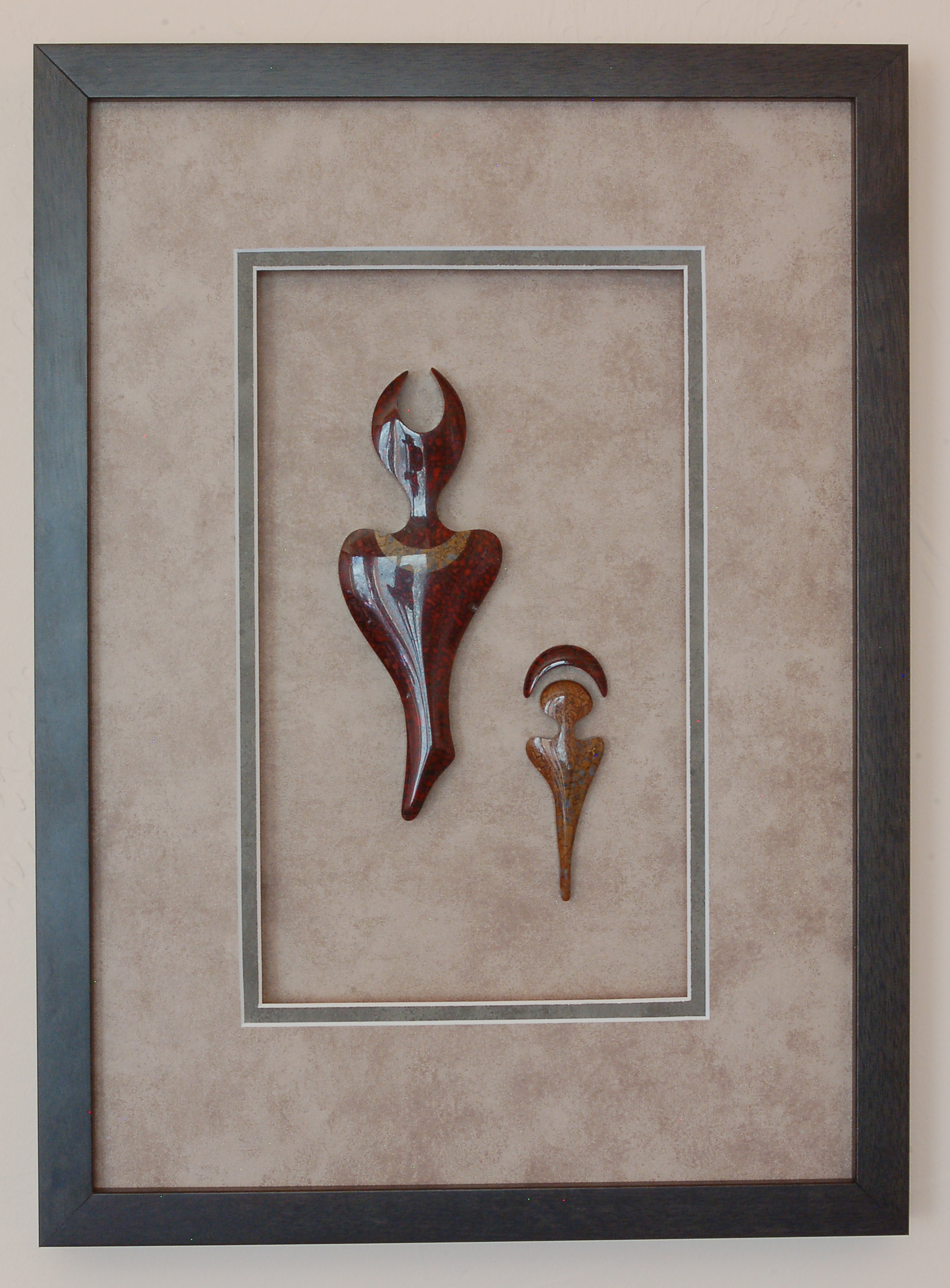 The "Shaman's" have been taking on a life of their own since I started them. Eventually, I will move into free-standing, three dimensional forms. The "Moab Shaman" is a representation of the shamanistic figures found on a pictograph panel in Courthouse Wash (Moab, Utah). In addition to many other forms, three of these figures were painted on a cliff face high above the Colorado River. They have been identified as Barrier Canyon Style figures, dating them at 1,200 to 4,000 years old. The power and majesty of the painted figures has been captured in this stunning sculpture. The size of the large shaman is 6" x 2-1/4". (The smaller figure is considered to be a “ghost” figure.) The size including the frame is approximately 13" x 17". |