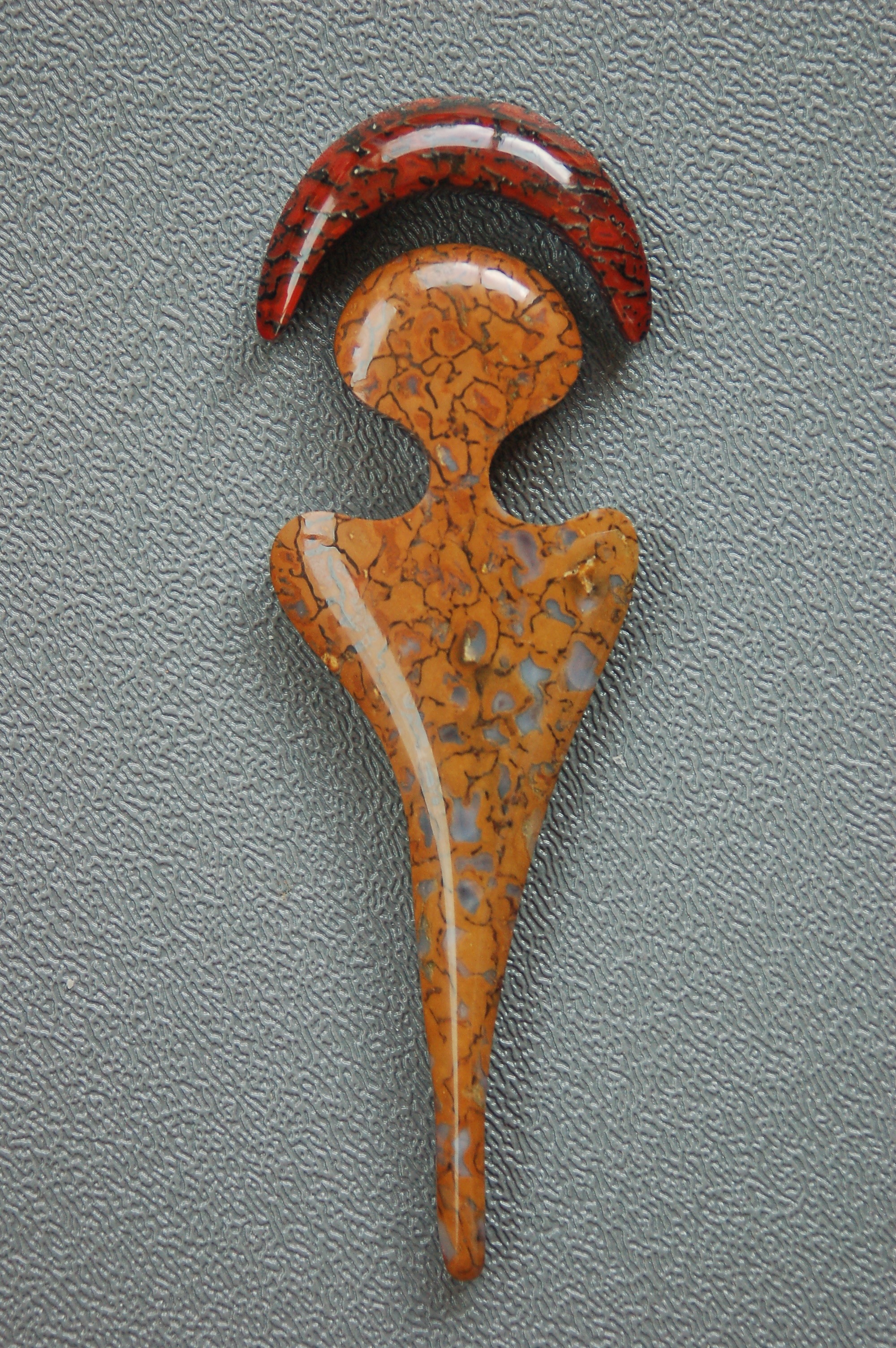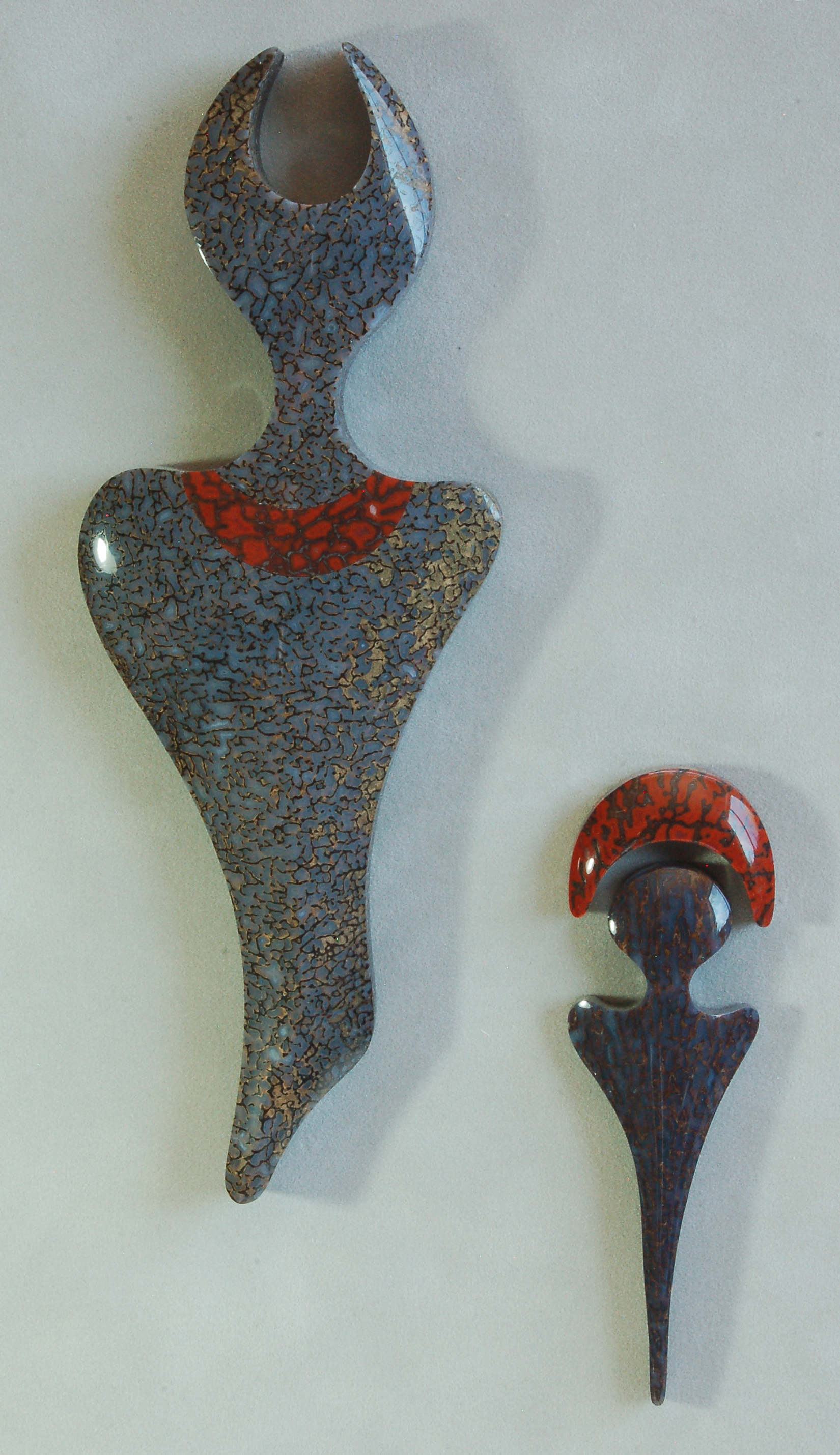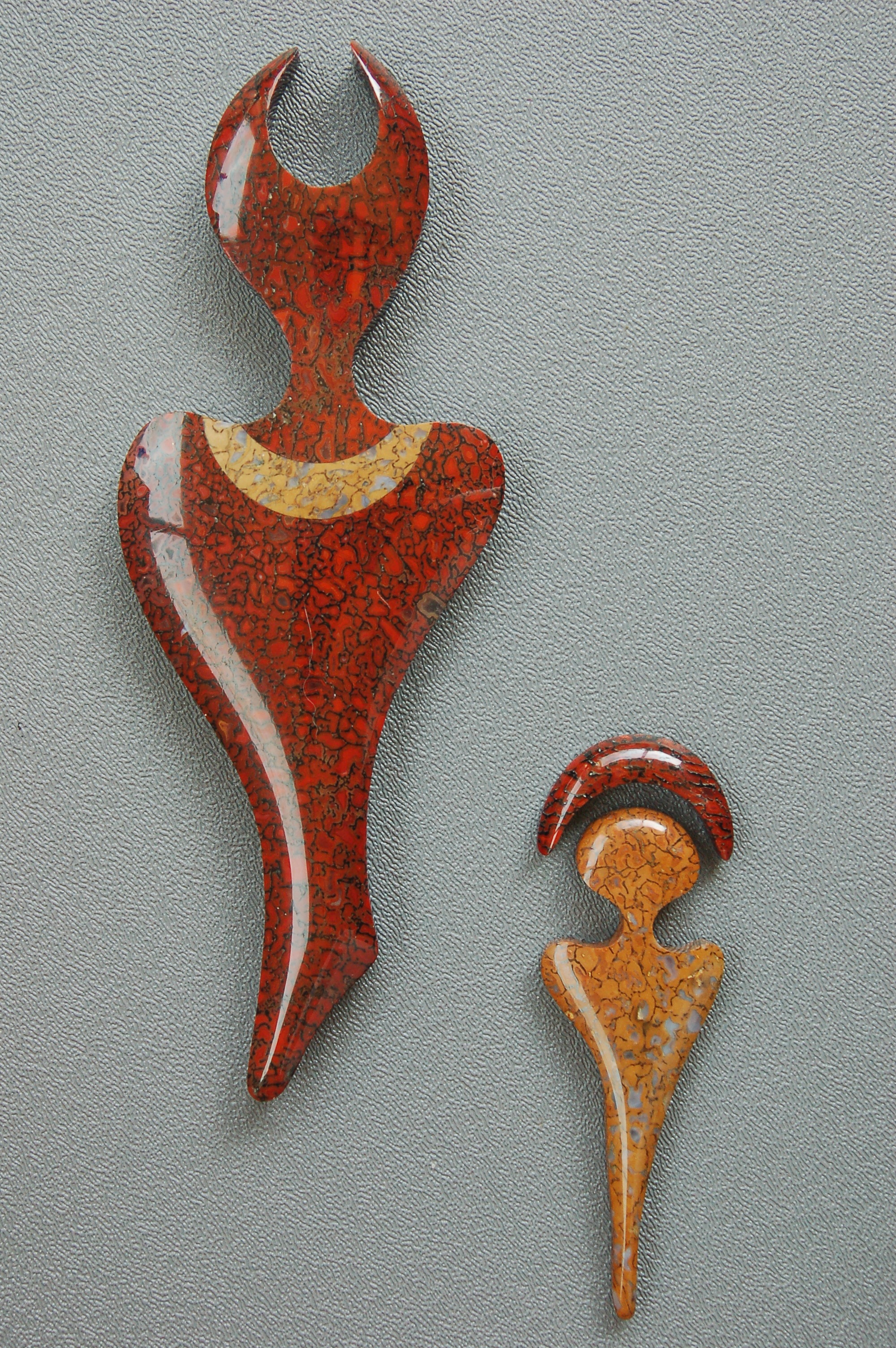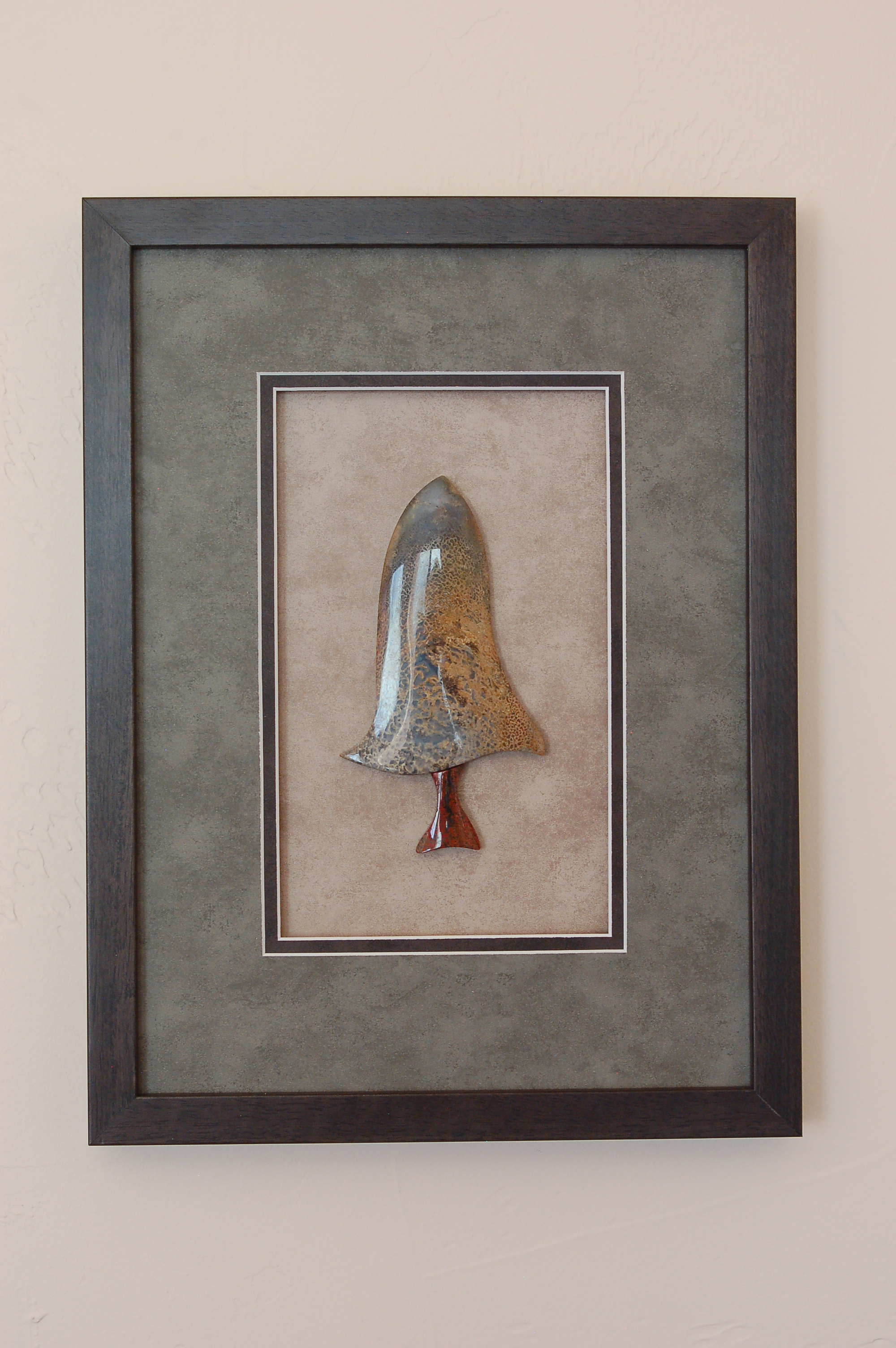 The "Shaman's" have been taking on a life of their own since I started them. Eventually, I will move into free-standing, three dimensional forms. The "Moab Shaman" is a representation of the shamanistic figures found on a pictograph panel in Courthouse Wash (Moab, Utah). In addition to many other forms, three of these figures were painted on a cliff face high above the Colorado River. They have been identified as Barrier Canyon Style figures, dating them at 1,200 to 4,000 years old. The power and majesty of the painted figures has been captured in this stunning sculpture. The size of the large shaman is 6" x 2-1/4". (The smaller figure is considered to be a “ghost” figure.) The size including the frame is approximately 13" x 17". |