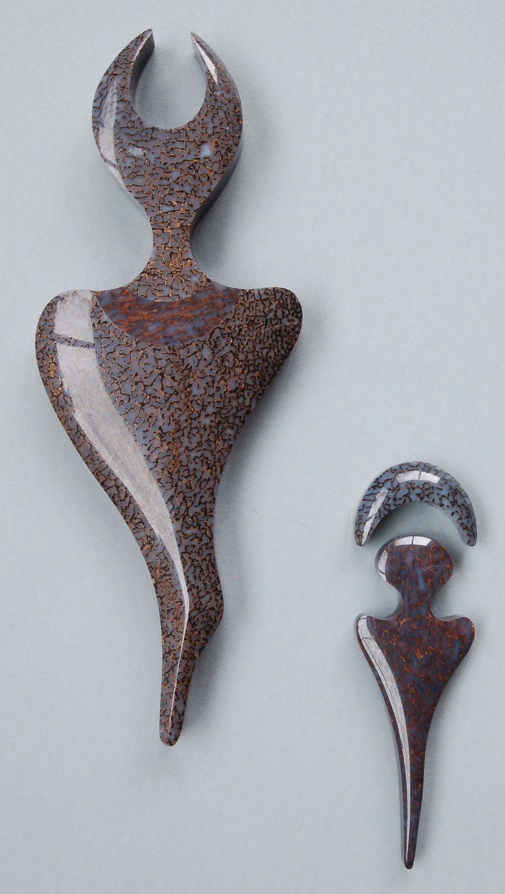 My work involves crafting a piece of agatized bone with flowing curves, ridges, valleys, and saddles to create a pleasing organic form. Combined with an exceptional polish, the result is a remarkably unique presentation. Taking advantage of the amazing color diversity of this material, every creation is distinctively one-of-a-kind! Each of the pieces identified will have several iterations made over time. Each iteration may vary slightly in design and shape but most of them will vary significantly in color. |