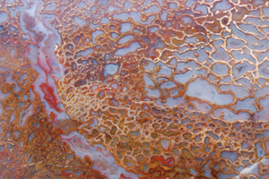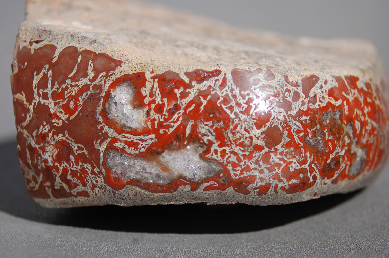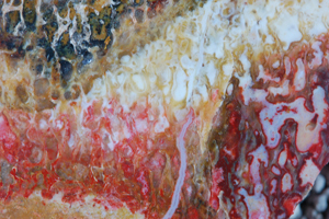 | PS-Jan-2014-C Jewelry-grade material with beautiful, rich red “cells” with a few blue/clear regions. The polished face is ≈3-1/4" x 1". The width is 3". It weighs 6.0 ounces. |