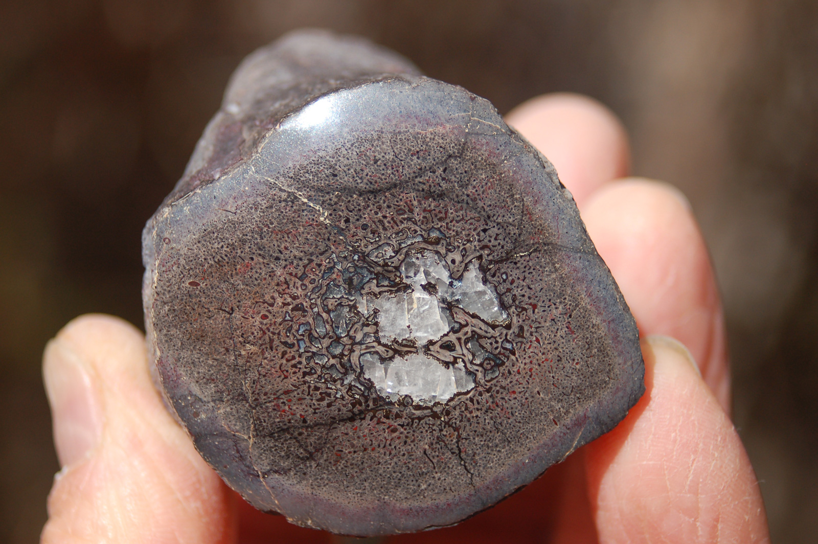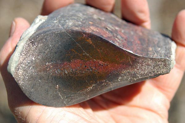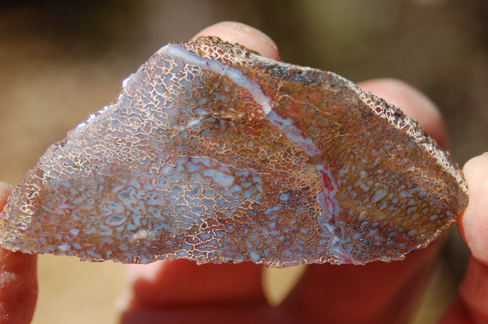 | PS-11-17-13-F This lovely specimen has been polished on both sides and displays a band of blue-red agate running through it. Both polished faces are ≈ 3" x 1-1/4" and the maximum width/thickness of the piece is ≈ 3/4". It weighs 2.2 ounces. |