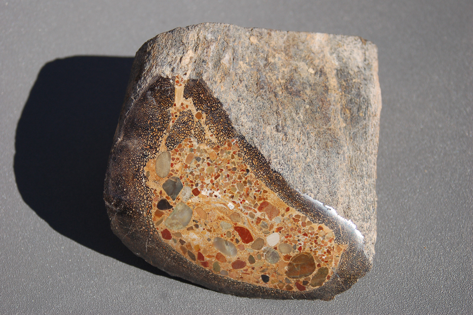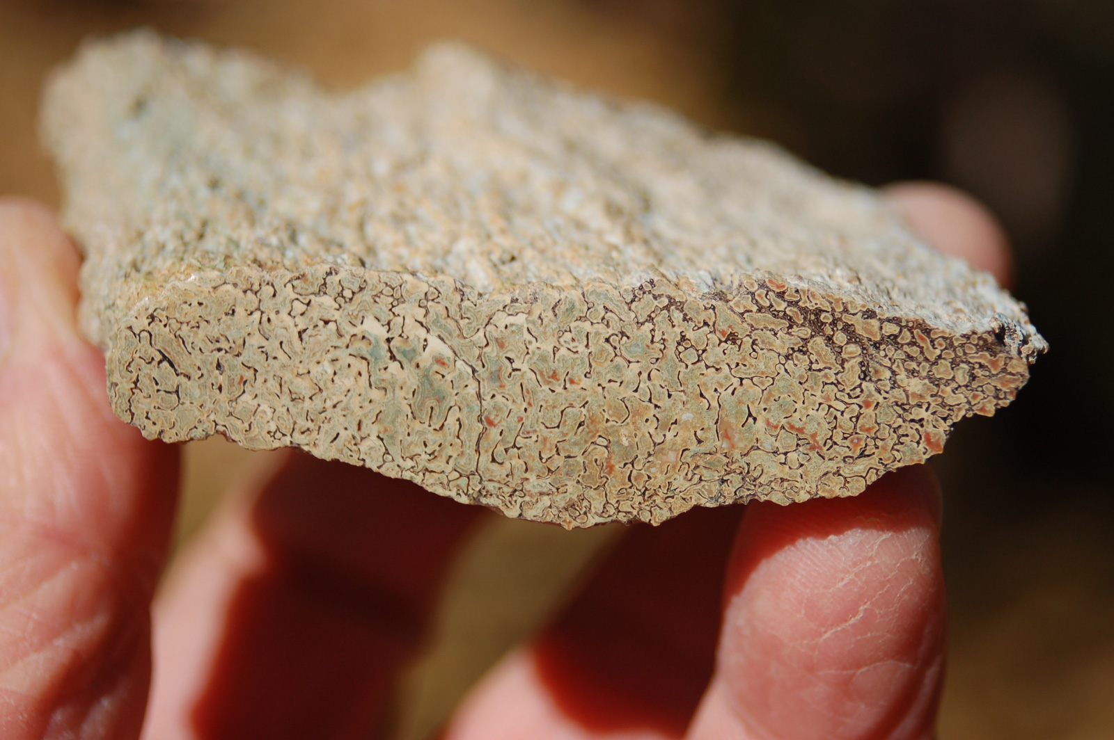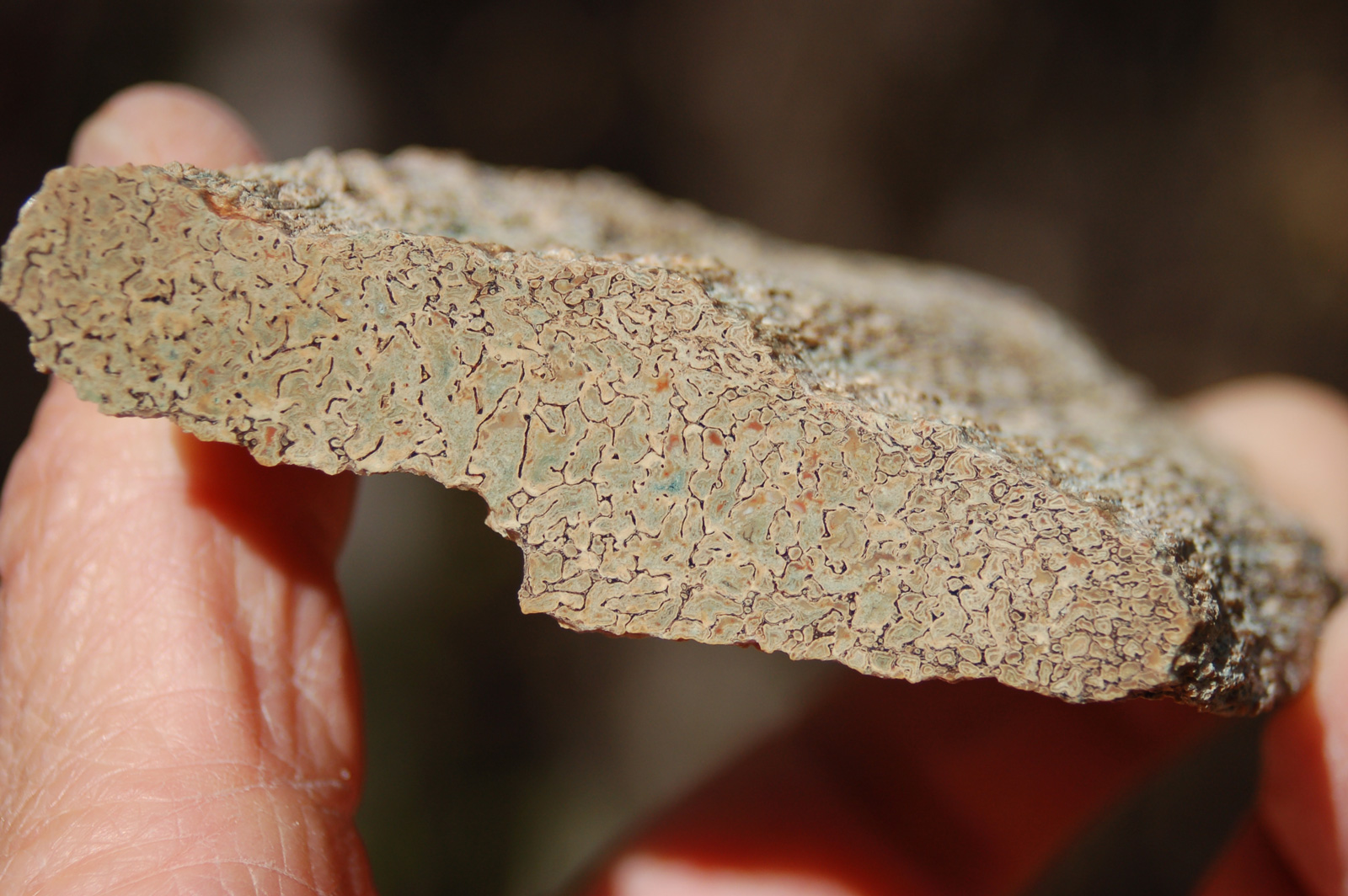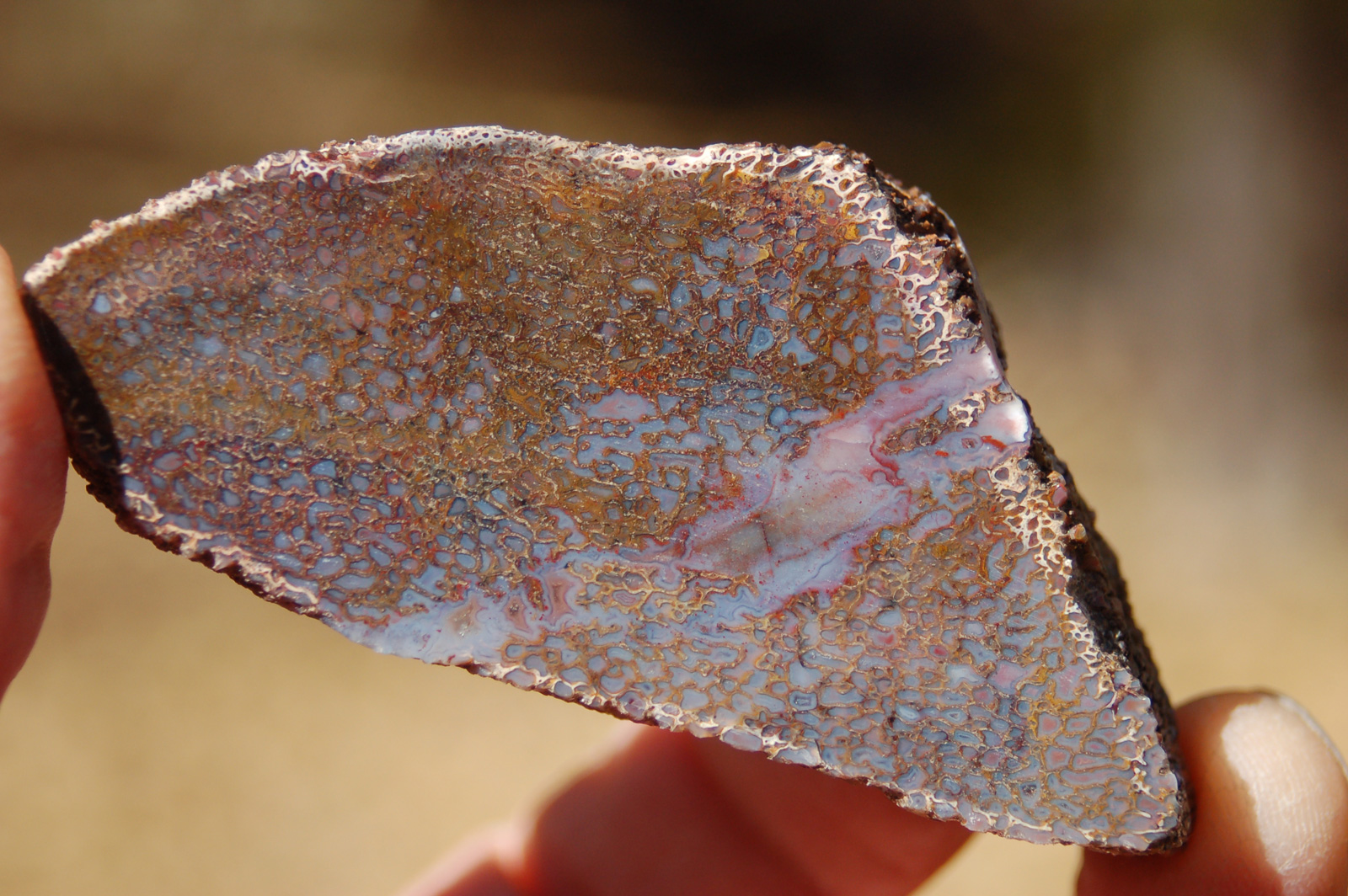| PS-11-17-13-H This is a great specimen that is polished on both ends. It has green, blue, and red agatized material embedded in a tan trebecular matrix. The polished faces are ≈ 2-3/4" x 3/4" and the width/thickness of the piece is ≈ 2-1/2". It weighs 5.5 ounces. |
