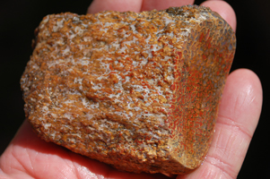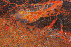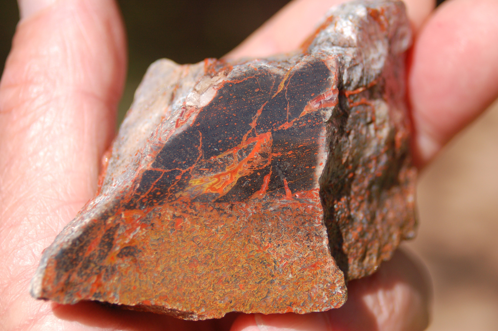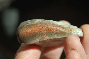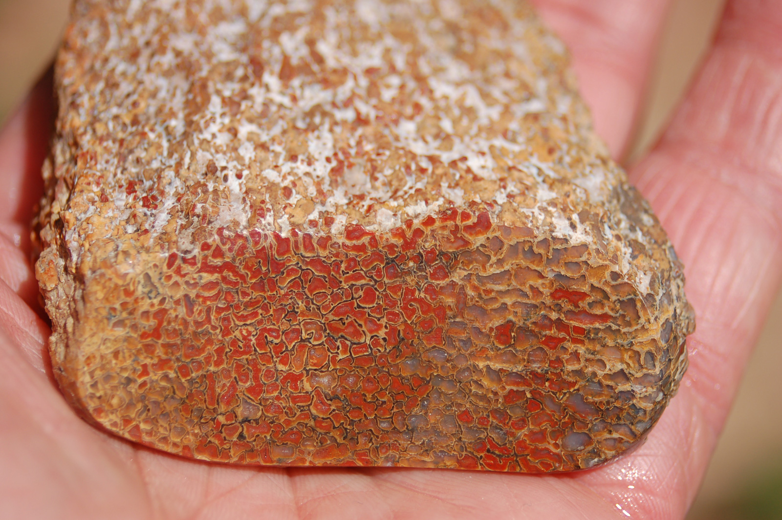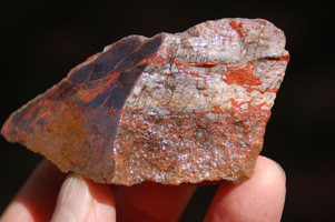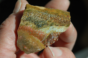 | PS-Jan-2014-E This striking specimen has bands of red agatization running through it and a beautiful red/yellow fortification in the polished face. The polished face is ≈1-3/4" x 1-1/2". The width is 1-1/4". It weighs 4.9 ounces. |