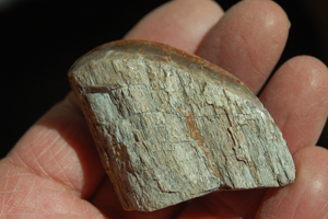 | PS-11-6-13-I This is a piece I spent a little more time on to create a unique shape. There is a curved ridgeline through the middle of the polished portion. Due to the extreme contours, photographing this was difficult, but it is a pronounced, clean edge. The piece itself appears to be a whole-round portion of a rib. |