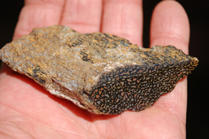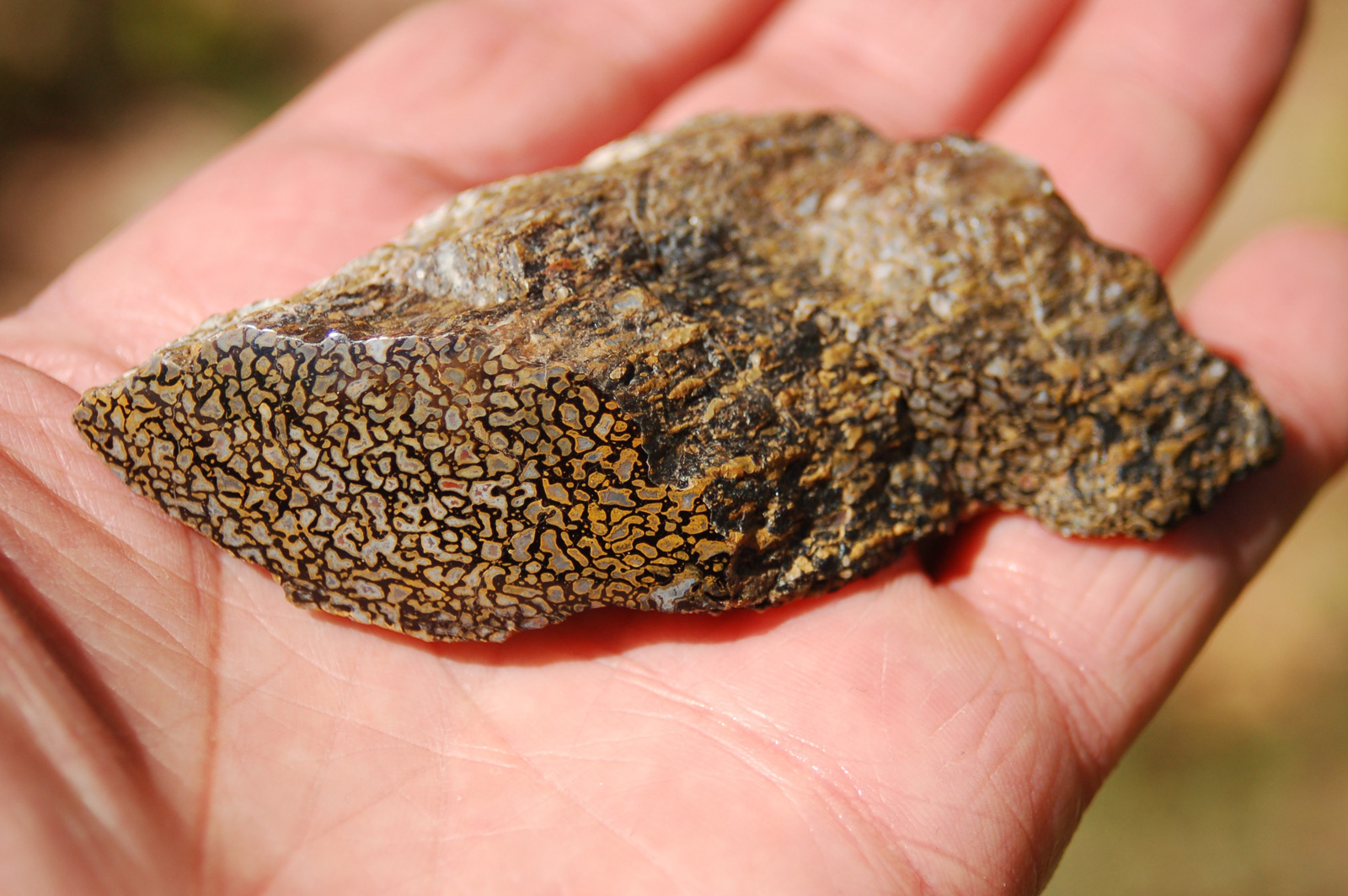 | PS-Jan-2014-A Because of the interesting color differences between the two sides of this piece, 2 faces have been carved and polished. One face has a concave shape, the other face is slightly domed. One has a black matrix and the other a tan-gold matrix. Both polished faces are ≈2" x 7/8". The width of the piece is 2". It weighs 3.2 ounces. |