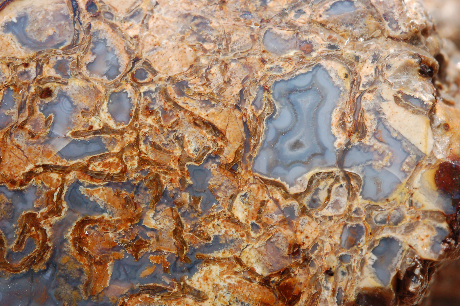 | PS-Jan-2014-G This unique polished specimen piece has large, beautiful, blue fortified “cells” in a light brown matrix. The polished face is ≈1-7/8" x 1". The length is 3". It weighs 5.8 ounces. |